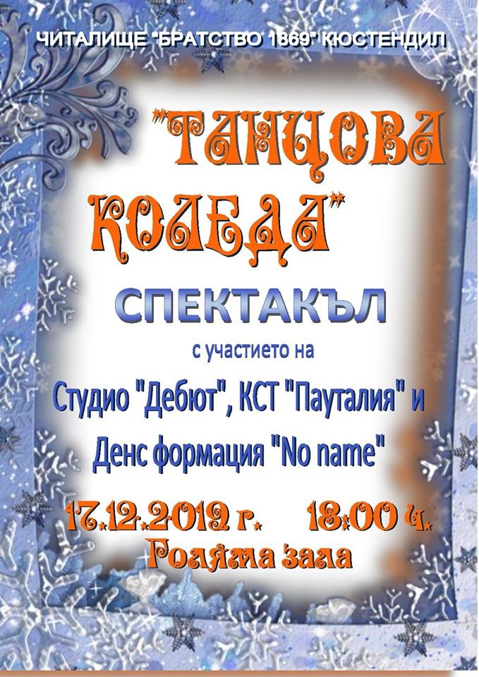 Днес в Голямата зала на читалище „Братство 1869” ще се проведе спектакъл „Танцова Коледа” с участието на Студио „Дебют” с ръководител Димитрина Укалска, КСТ „Пауталия” с ръководител Петя Димитрова, Денс формация „Nо Name” с ръководител Мариета Попадийна и др.