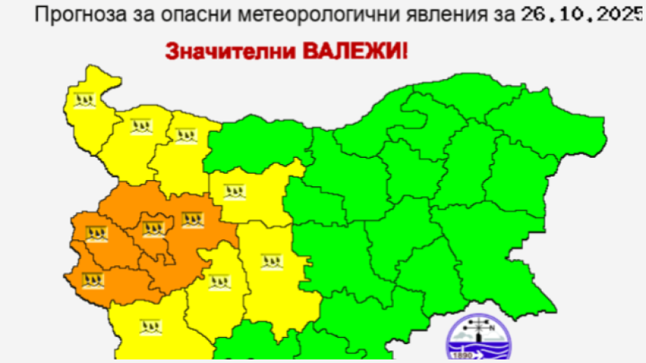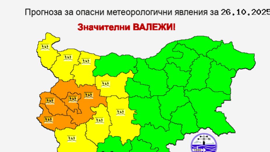 Оранжев код за значителни валежи е издаден за София-област и град, и за областите Перник, Кюстендил и Благоевград. Жълт код е издаден за областите Пловдив, Пазарджик, Враца, Монтана и Видин.
