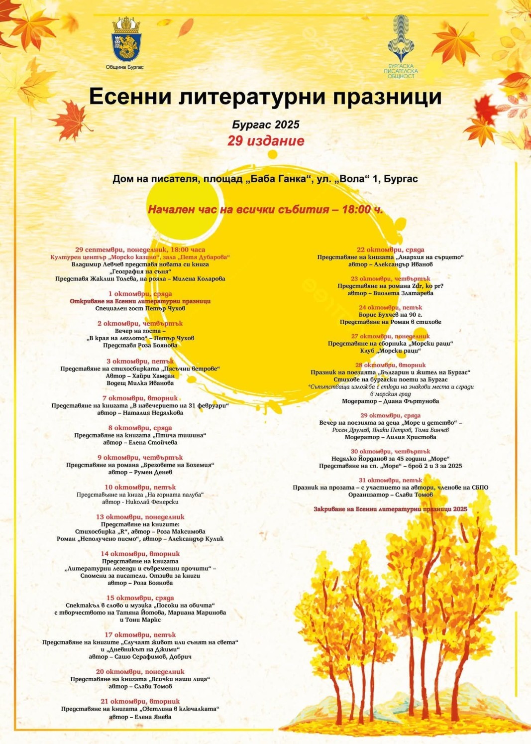 Носителят на редица престижни национални и международни литературни награди-поетът, писател и музикант Петър Чухов бе специален гост на откриването на Есенни литературни празници 2025. Тази вечер от 18 часа е представянето на неговата нова стихосбирка "В края на леглото".
