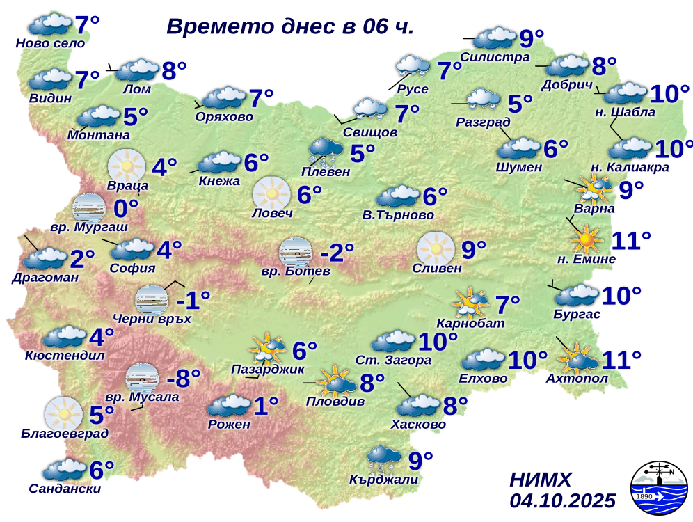 Днес облачността над повечето райони ще се задържи значителна. Валежи от дъжд ще има на много места главно в източната половина от страната, като през втората половина на деня те ще спират. Ще духа до умерен вятър от запад-северозапад. Максималните температури ще бъдат между 8° и 13°, по-високи - в югоизточните райони и по Черноморието, за София – около 8, показва прогнозата за времето за 4 октомври на Националния институт по метеорология и хидрология.