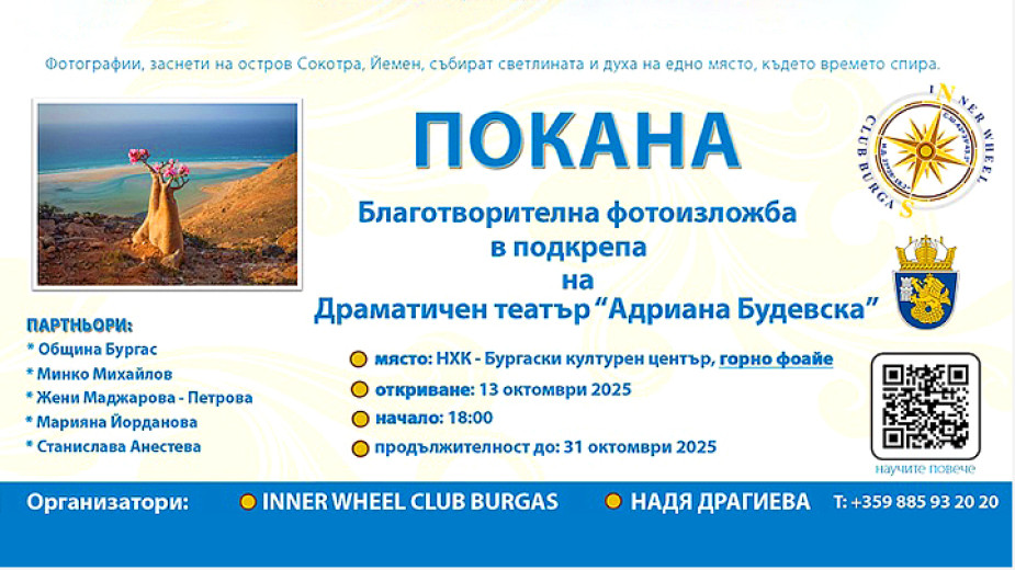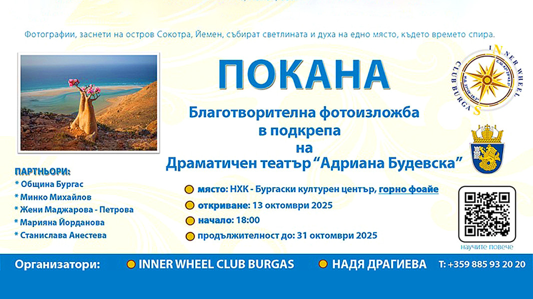 Благотворителна фотоизложба в помощ на бургаския драматичен театър „Адриана Будевска“ организират дамите от Inner Wheel Club Burgas. Откриването е на 13 октомври от 18:00 часа във фоайето на втория етаж на Културния дом на Нефтохимика.
