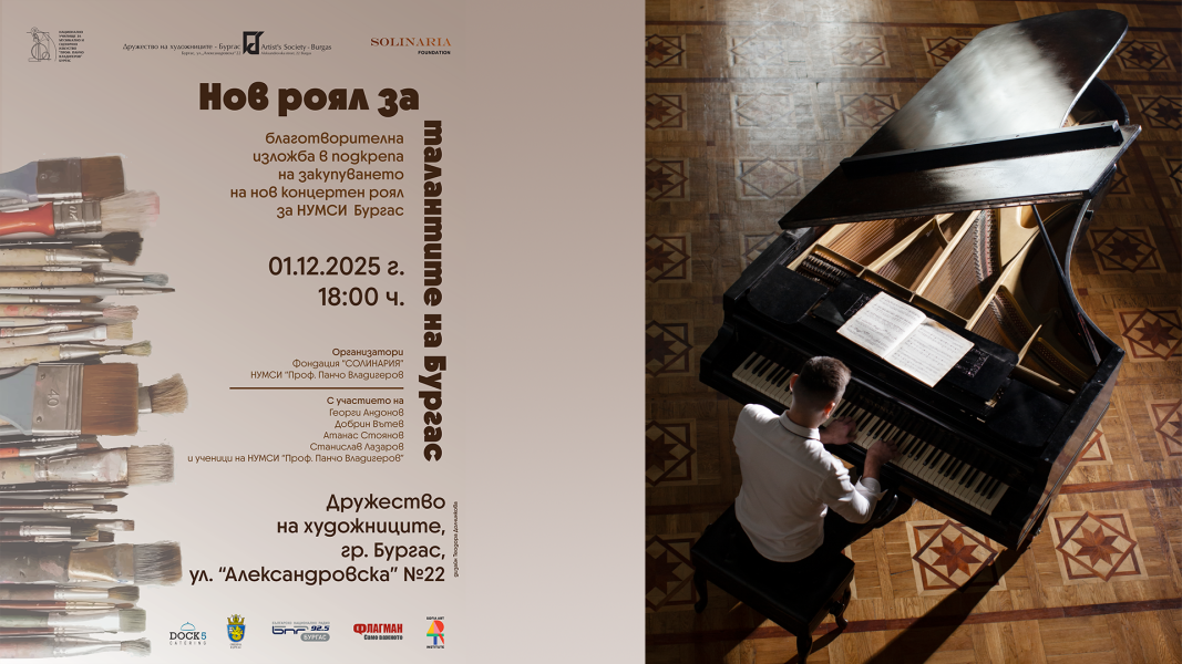 Благотворителна изложба под надслов "Нов роял за талантите на Бургас" ще събере средства за Националното училище за музикални и сценични изкуства "Проф. Панчо Владигеров". Събитието ще се проведе на 1 декември от 18:00 ч. в Дружеството на художниците – Бургас.