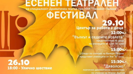 В Плевен с празнично шествие на 26 октомври започва Есенният театрален фестивал на учениците от специалността "Актьорство за драматичен театър" при Националното училище по изкуствата "Панайот Пипков". Представленията са за деца и възрастни, а какво са подготвили младите театрали разказа режисьора Детелина Станева. Детелина Станева е..