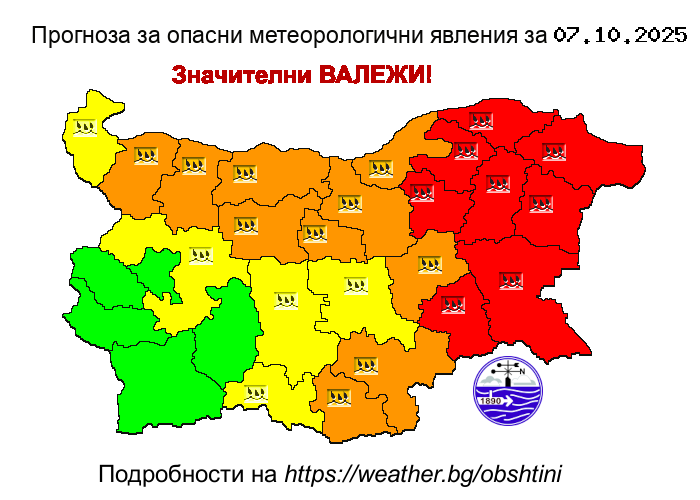 Червен предупредителен код за значителни валежи издаде за утре, 7 октомври, Националният институт по метеорология и хидрология за 8 области в Източна и Североизточна България.