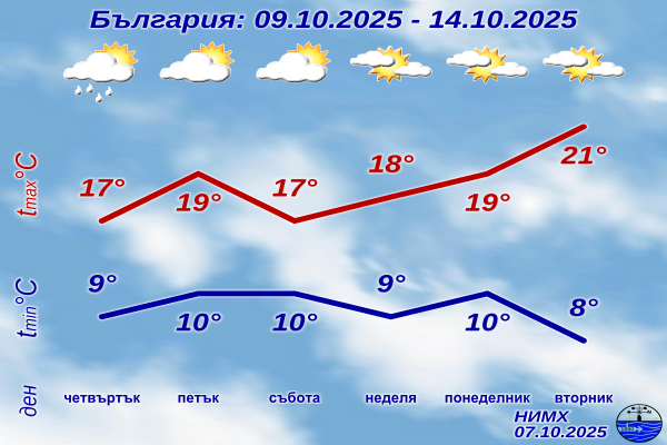В западната половина вероятността за валежи е малка, облачността ще се разкъсва и ще намалява. Дневните температури ще се повишат и на отделни места ще достигат 20°.
