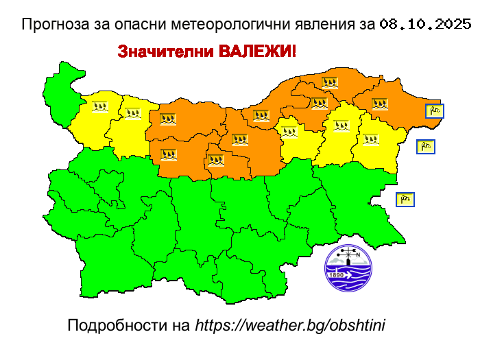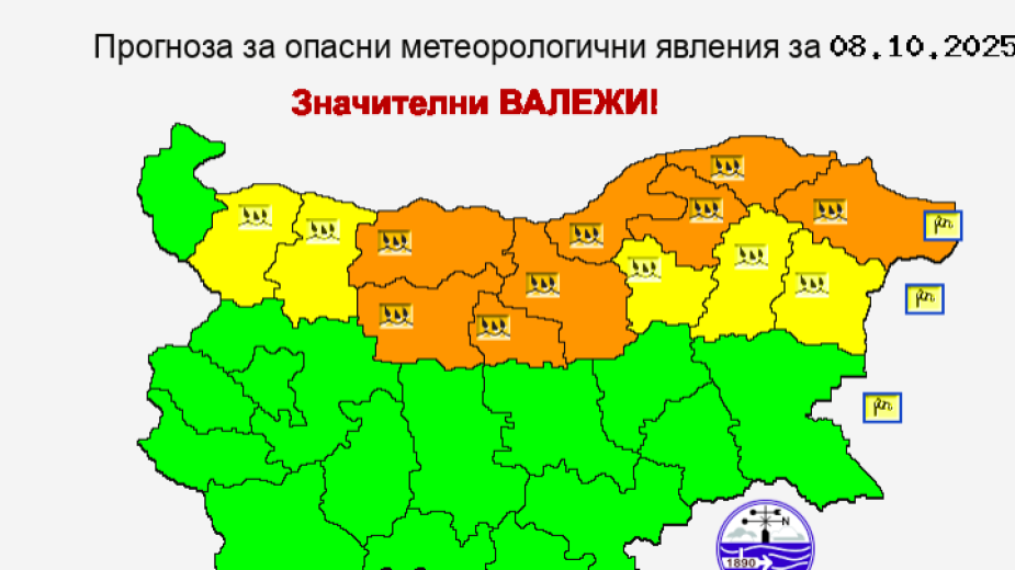 Оранжев код за значителни валежи е обявен за областите Плевен, Ловеч, Велико Търново, Ловеч, Русе, Разград, Добрич и Силистра. За областите Монтана, Враца, Габрово, Търговище, Шумен и Варна кодът е жълт.