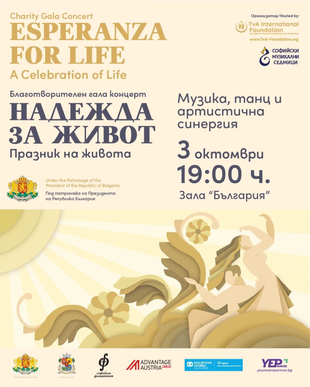 На 3 октомври от 19.00 ч в зала "България" изтъкнати класически музиканти и популярни артисти ще подкрепят най-уязвимите с гала-спектакъла, който се организира, за да подпомогне Центъра за обществена подкрепа – Перник в помощ на деца и семейства в риск, чрез дейности насочени към подкрепа за семейството и превенция на раздялата, както и изграждането на първия по рода си холистичен център в помощ на деца в нужда и безстопанствени животни, носещ името Esperanza for Life/"Надежда за живот".