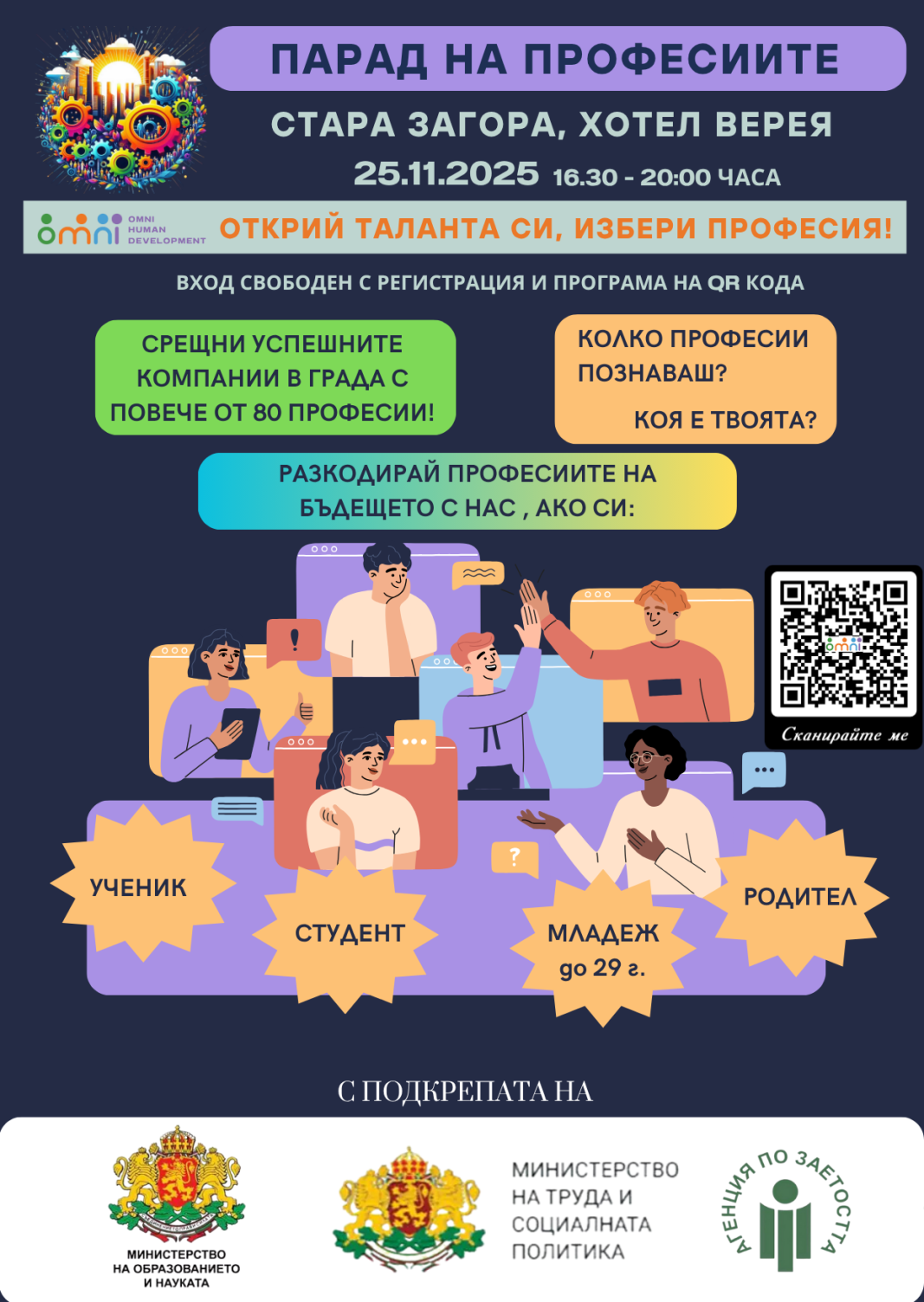 Днес в Стара Загора ще се състои първото издание на форума "Парад на професиите", който се организира от ОМНИ Human Development, с подкрепата на Министерството на труда и социалната политика и Министерството на образованието и науката. Партньор на събитието е Търговско-промишлената палата – Стара Загора.