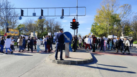 Протестиращите медици от УМБАЛ "Пловдив" блокираха бул. "България" на кръстовището с ул. "Дилянка". Протестът им започна в 12.30 часа, а блокадата на булевард България беше за около 5 минути. Заради протеста се образува сериозна на тапа на кръстовището. "Искаме си д-р Генев и настояваме той да остане", заяви началникът на педиатрията д-р Анеса..