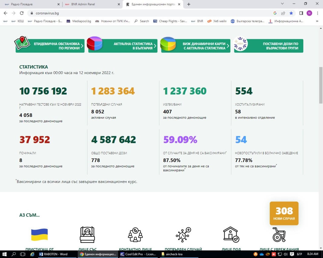 308 са новите случая на коронавирус през последното денонощие у нас. Починали са осем души, показват данните на Единния информационен портал.