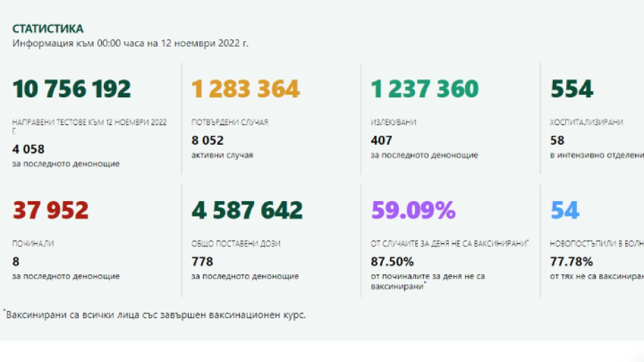 Процентът на положителните проби е 7,6. Активните случаи са 8052. Хоспитализирани са 554-ма, 58 от които - в интензивно отделение. Според данните на здравните власти броят на заразените и постъпилите в болница в сравнение с предишната седмица спада. В Пловдив новите случаи на Ковид – 19 са 23, в Пазарджик – 7, в Смолян – 5.