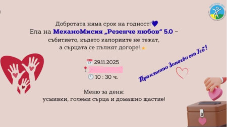 Добротата няма срок на годност - това е основният лайтмотив и верую на всички Механовци! "МеханоМисия: Резенче любов" е събитието, което осъществяват за пета поредна година, за добра кауза в подкрепа на децата от Фондация „Паралелен свят“. "Тази събота /29 ноември/ от 10:30 часа, Механовци Ви канят на ден, в който не само готвим, а творим..
