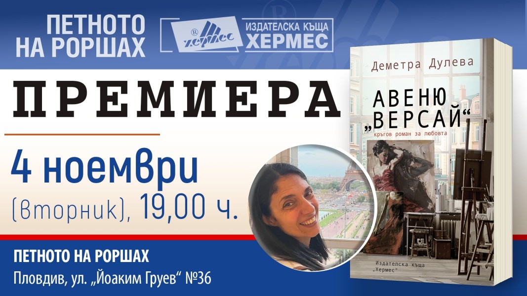 Премиера на романа на Деметра Дулева "Авеню "Версай" ще се състои тази вечер в литературен клуб "Петното" в Пловдив. Модератор на събитието е писателят и драматург Александър Секулов.