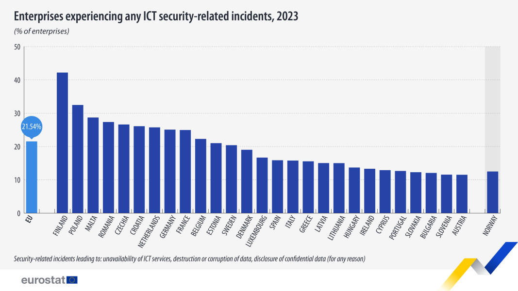 През 2023 г. 21,5% от предприятията в ЕС са преживели инциденти със сигурността на информационни и комуникационни технологии (ИКТ), довели до различни видове последици, като например недостъпност на ИКТ услуги, унищожаване или повреда на данни или разкриване на поверителни данни, показва обобщена статистика на Евростат.