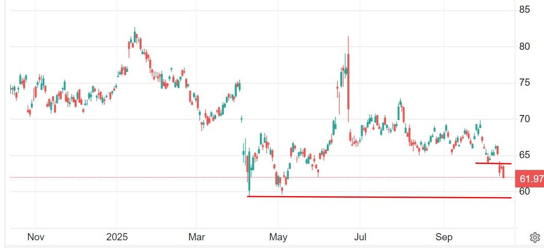 Към 11.45 часа българско време фючърсите на петрол Брент се понижават с 2% към 62,0 долара за барел, а тези на американския лек суров петрол WTI - с 2,11% към 58,20 долара за барел, достигайки най-ниски ценови нива от 7-8 май тази година.