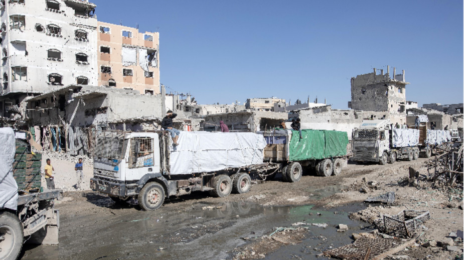 Около 560 тона храна са влезли в палестинския анклав след постигането на споразумението между Израел и палестинската групировка "Хамас", което влезе в сила на 10 октомври. Достъпът на камионите с помощи в северната част на ивицата Газа все още е затруднен заради блокирани и повредeните от войната пътища. Говорител на Световната продоволствена програма на ООН заяви, доставките все още са под необходимото ниво.
