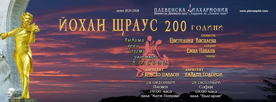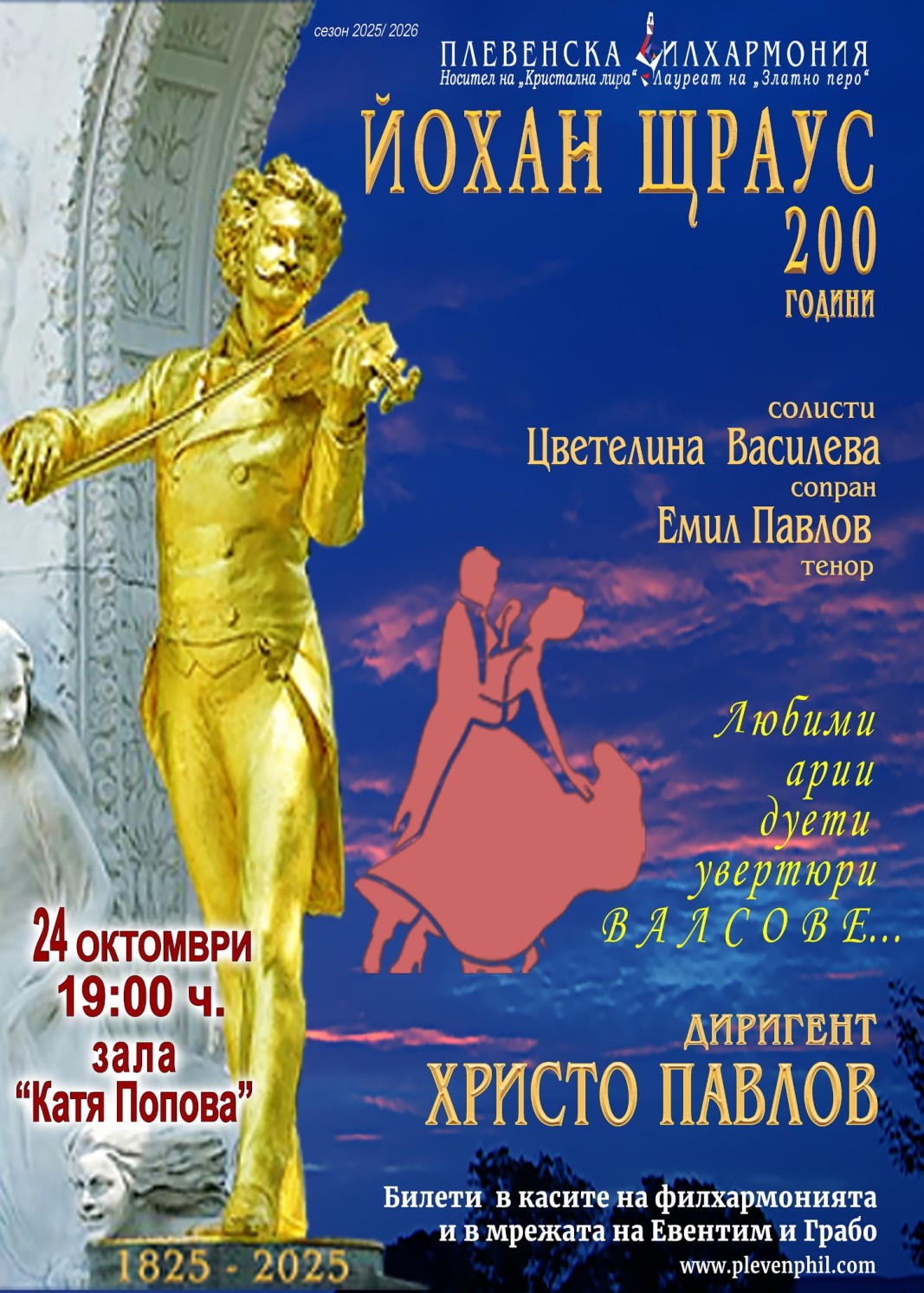В годината, в която отбелязваме 200 години от рождението на Йохан Щраус-син, Плевенската филхармония ще представи два вълнуващи концерта. Концертните вечери, посветени на композитора, наречен "Кралят на валса”, превърнал Виена в символ на музиката и танца, ще бъдат на 24 и 25 октомври..