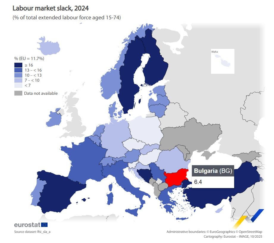 През 2024 г. незаетите лица в ЕС са били 11,7% от работната сила, а в България - едва 6,4%