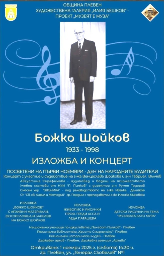 В най-голямата градска галерия в Плевен "Илия Бешков" отбелязват Деня на народните будители с три изложби и концерт, посветени на твореца, преподавателя, диригента и композитора Божко Шойков.