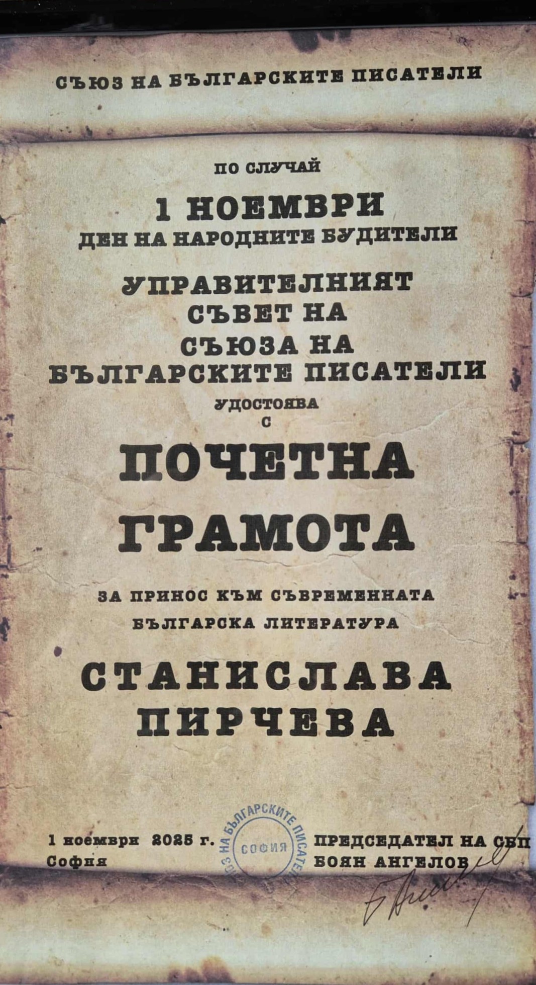 Журналистката от Програма "Хоризонт" на БНР и водещ на предаването "Нощен хоризонт" Станислава Пирчева бе отличена от Съюза на българските писатели с Почетна грамота в категория "За принос към съвременната българска литература".