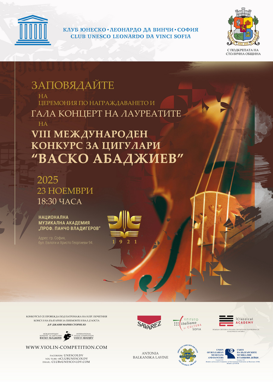 Международният конкурс за цигулари "Васко Абаджиев" е сред вдъхновяващите събития за млади таланти на класическата сцена в столицата. Осмото издание ще се проведе от 20 до 23 ноември в Националната музикална академия „Проф. Панчо Владигеров“, а кулминацията ще бъде тържественият галаконцерт на лауреатите – на 23 ноември от 18:30 ч.