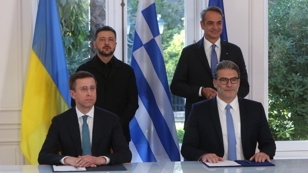 Освен Зеленски и Мицотакис на подписването присъства и новият посланик на САЩ в Атина Кимбърли Гилфойл.