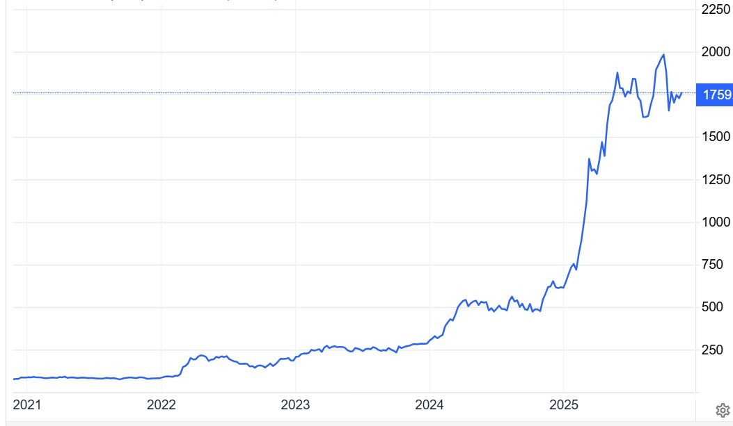 Приходите на Rheinmetall вече почти са се удвоили през последните три години, а акциите са се повишили с около 190% досега през 2025 г. и с около 900% през последните три години.