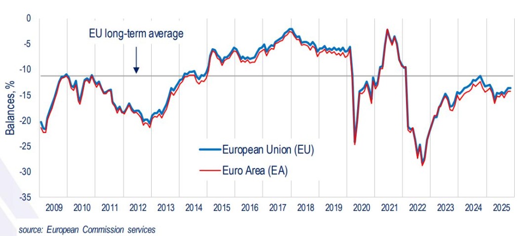 Стабилизацията в 8-месечен връх, но под дългосрочните осреднен нива, предполага, че домакинствата все още са предпазливи, въпреки че инфлацията отслабва, а европейската икономика показва известна устойчивост на тарифната политика на американския президент Доналд Тръмп.