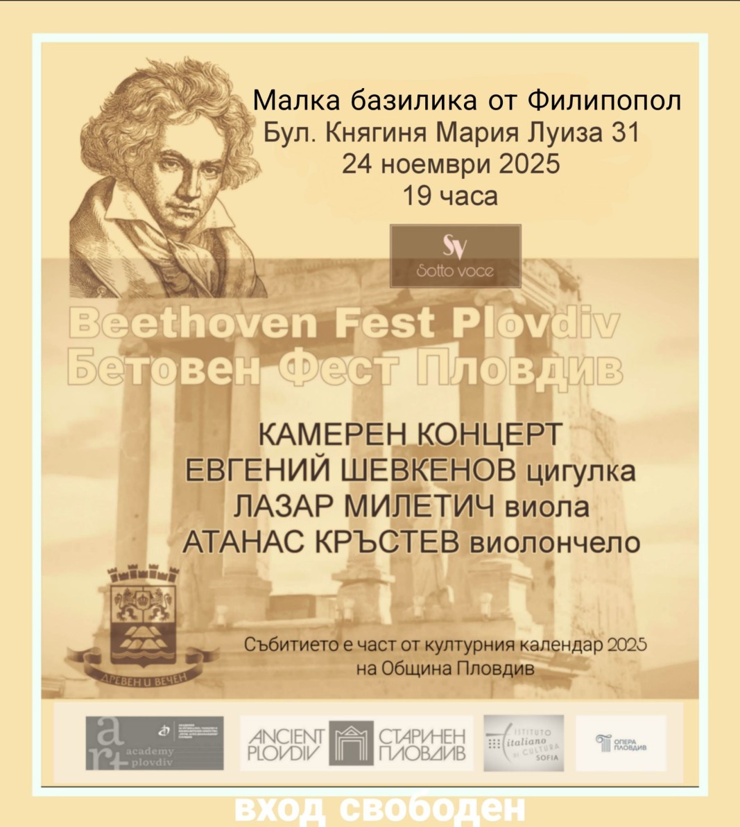 С три концерта именити музиканти почитат годишнината от раждането на Лудвиг ван Бетховен, като откриването е тази вечер в Малката базилика на Филипопол в Пловдив.
