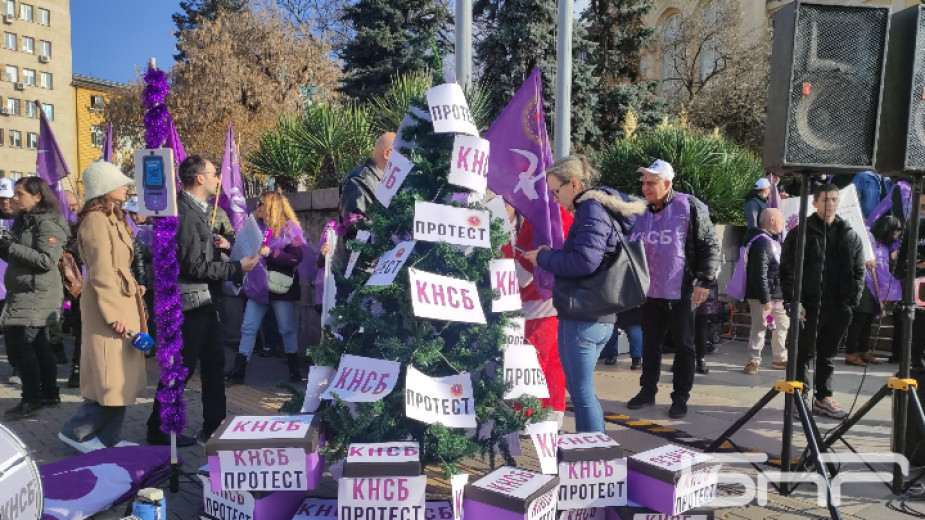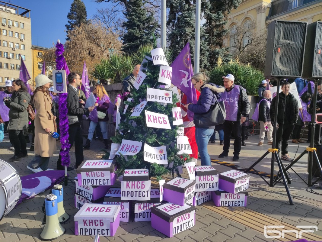 Протестна коледна елха, но с празни кутии под нея, поставиха синдикалистите на жълтите павета в центъра на София, в близост до служебния вход на парламента.