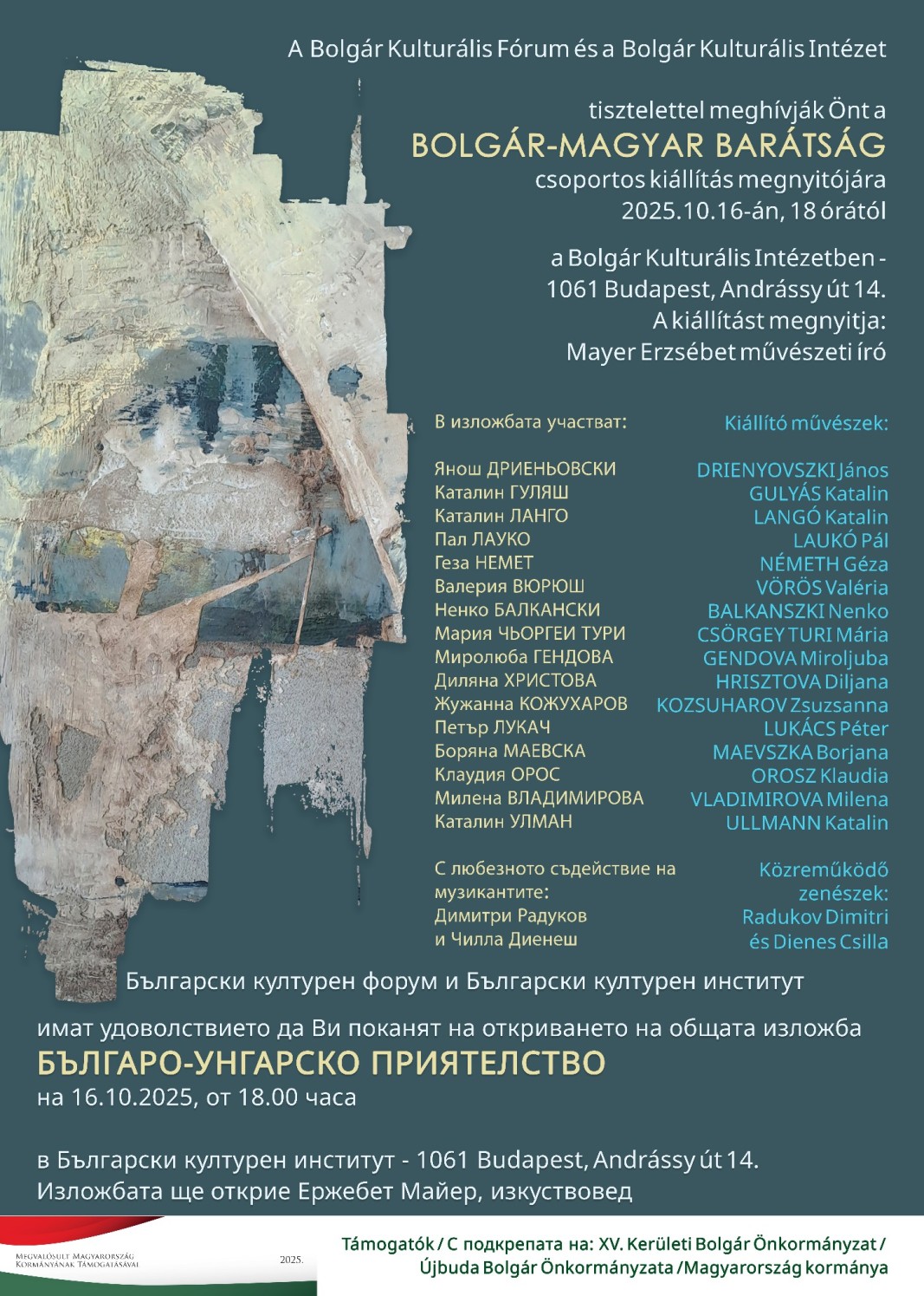 На 15 октомври в Будапеща ще бъде открита изложба на носители на наградата на името на унгарския художник Миклош Мажаров, по баща българин. В 18:00 часа на следващият ден в Българския културен институт в Будапеща (1061 Budapest, Andrássy út 14.), ще бъде открита обща изложба, наречена „Българо-унгарско приятелство“, информира Българското републиканско самоуправление в Унгария.