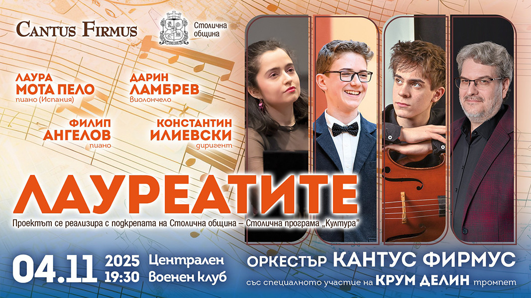 В рамках успешного проекта "Лауреаты" оркестр Cantus Firmus вновь представляет болгарской публике ярких молодых исполнителей классической музыки, удостоенных наград престижных конкурсов. 4 ноября в Центральном военном клубе выступят обладатели Гран-при Четвертого национального конкурса молодых инструменталистов Cantus Firmus.