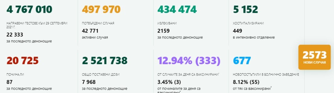 Новозаразените с коронавирус в България през изминалото денонощие са 2573. Положителни са 11,5% от направените 22 333 теста, сочат данните на Единния информационен портал.