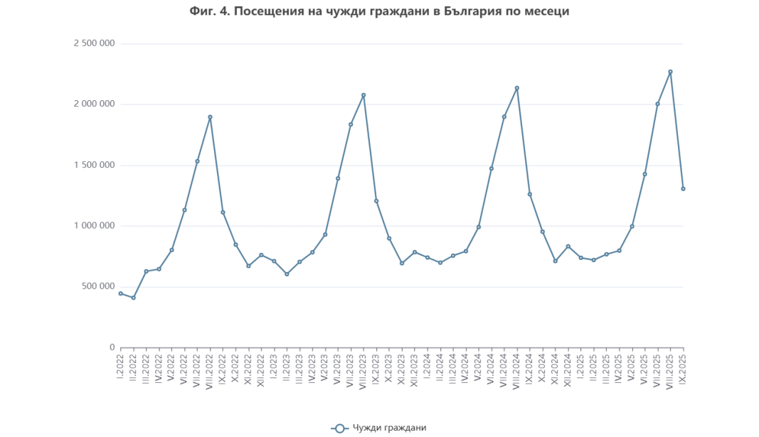 В същото време нашата страна е посетена от 1,306 млн. чужденци, или с 3,5% повече спрямо септември 2024 г. Транзитните преминавания през страната обаче са 31,6% (412,6 хил.) от всички посещения на чужденци в България през септември.