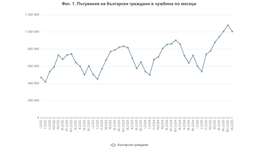 Пътуванията на български граждани в чужбина през септември са 1,005 милиона, или с 17,1% над регистрираните през същия месец на 2024 г., като пътникопотокът на българите в посока чужбина е малко по-нисък от пика през летния почивен месец август, когато той достигна 1,0789 милиона.
