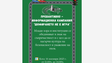 Световният ден за възпоменание на жертвите от пътнотранспортни произшествия, който през 2025 г. е на 16 ноември, ще бъде отбелязан в Стара Загора с информационна кампания под мотото „Шофирането не е игра“. На 16 ноември от 11 до 14 ч. в парк..