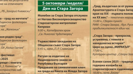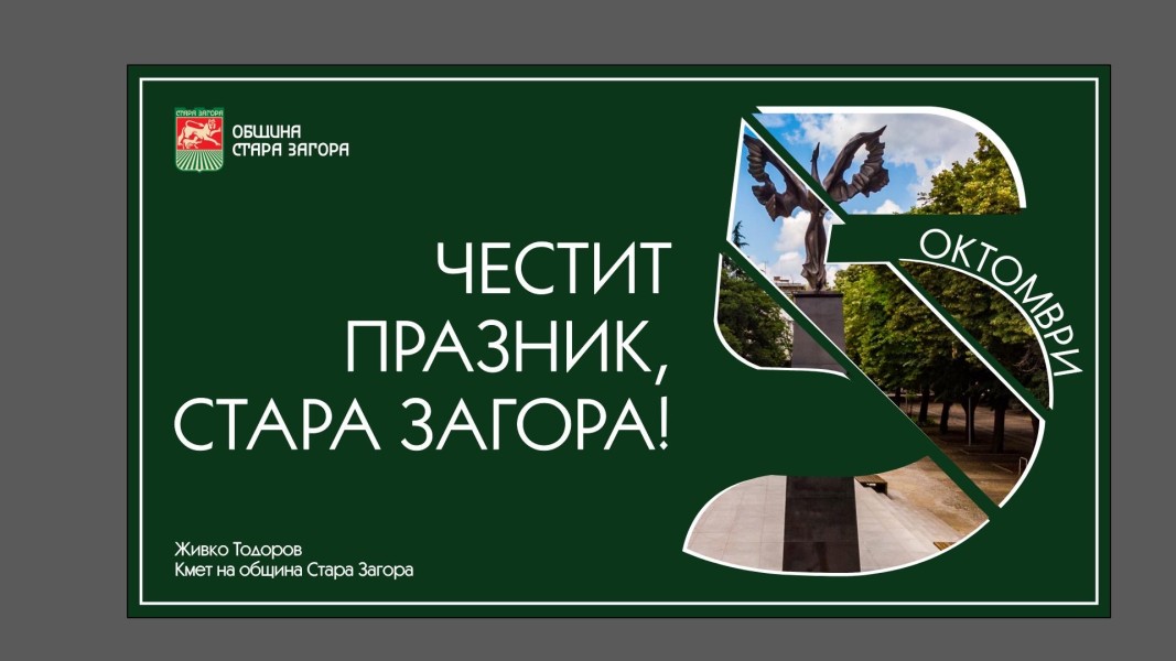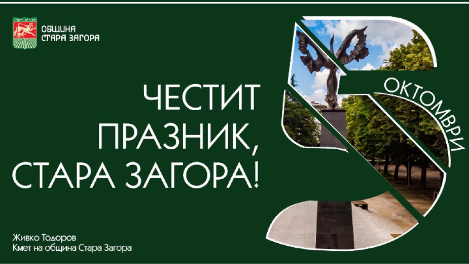 Стара Загора отбелязва своя празник на 5 октомври. Богата фестивална, културна и спортна програма са подготвили от общината за празника, като кулминацията ще е концерт на Лили Иванова.