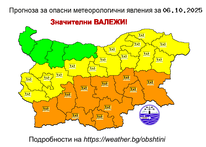 Жълт и оранжев код за значителни валежи издаде за днес Националният институт по метеорология и хидрология за почти цялата страна