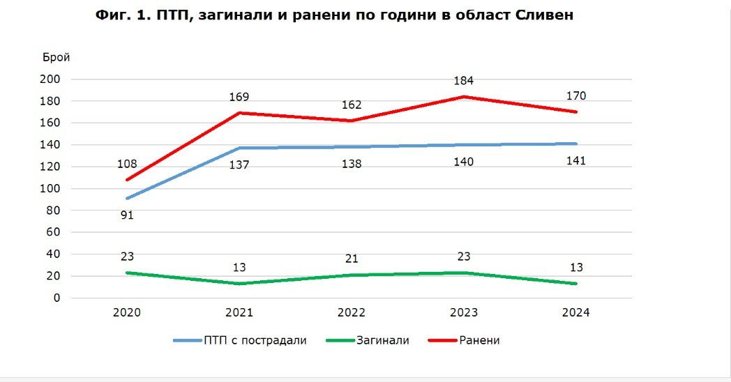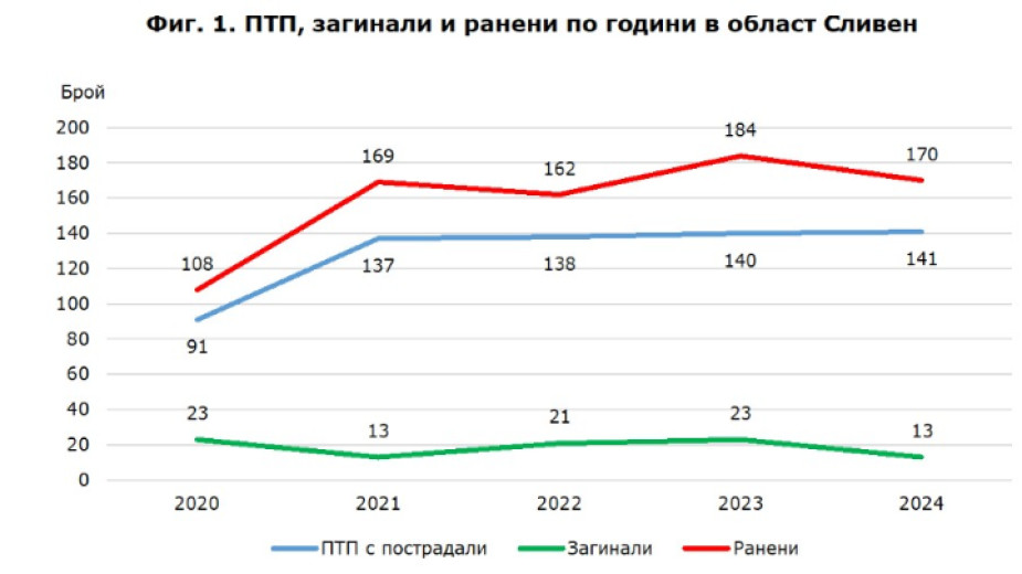 Намалява броят на загиналите и ранените при катастрофи в област Сливен, сочат данните на Териториално статистическо бюро Югоизток към НСИ за пътната безопасност в региона. През 2024 г. на територията на област Сливен са регистрирани 141 тежки пътнотранспортни произшествия (ПТП), при които са загинали 13 души, а 170 са ранени. В сравнение с 2023 г. се увеличава броят на произшествията с 0.7%, докато броят на загиналите и ранени лица намалява, съответно с 43.5 и 7.6%.
