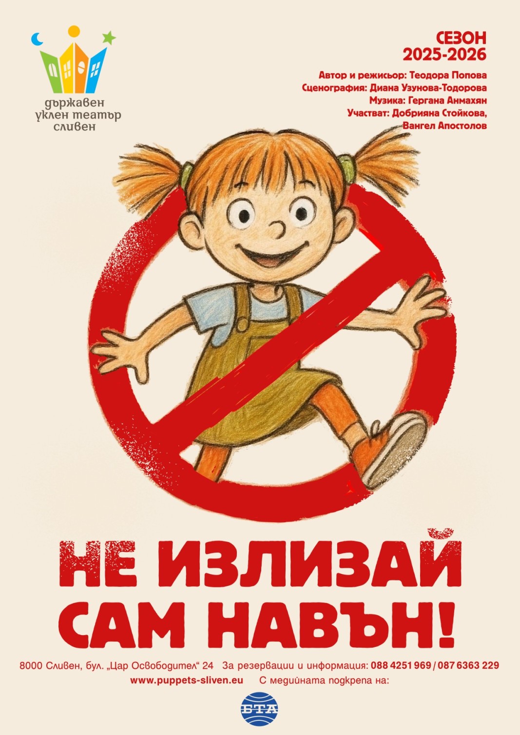 Държавният куклен театър в Сливен кани своите почитатели от 3 до 6 г. на своя премиерен спектакъл „Не излизай сам навън!“ на 9-и ноември, от 11 ч. „Историята на 5 годишната Цвети ще запознае децата с правилата за движение и безопасност на пътя, - много важна и вечно актуална тема.“, каза за РСЗ ,Теодора Попова – автор на постановката. Спектакълът се реализира от добре сработено трио от три жени, които са приятелки на сцената и в живота - сценографията е на Диана Узунова-Тодорова, музиката на Гергана Анмахян и режисурата на Теодора Попова. Персонажите оживяват с гласа и лицата на Вангел Апостолов и дебютантката Добрияна Стойкова.