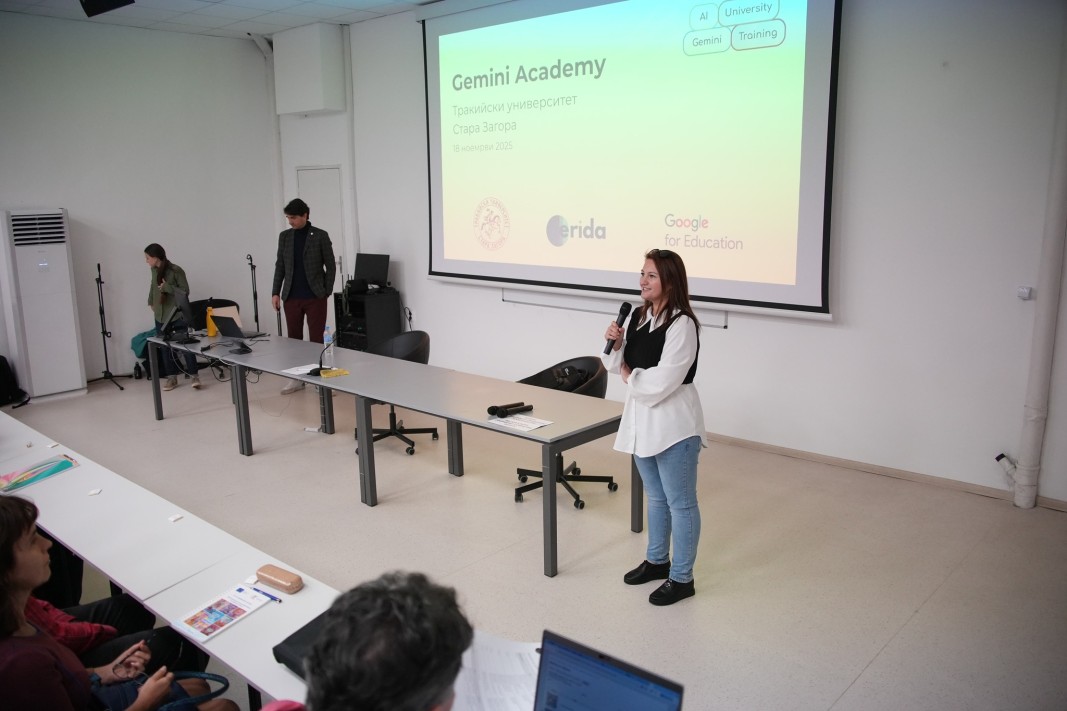 Припомняме, че на 19 ноември в зала 3 на Стопански факултет на Тракийски университет се проведе първото по рода си присъствено Google AI обучение за висше образование. Събитието беше официално открито от заместник-ректора по дигитализация и международно сътрудничество доц. Габриела Кирякова. Тя подчерта значението на изкуствения интелект като стратегически приоритет за модерното образование и позиционирането на университета сред иновативните академични институции.
