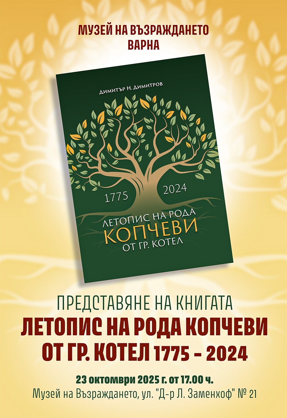 Книгата "Летопис на рода Копчеви от гр. Котел 1775 – 2024 г." ще бъде представена на 23 октомври, четвъртък, от 17 часа в сградата на Музея на Възраждането. Тя е генеалогично изследване на варненския общественик Димитър Димитров. Проследявайки хронологично развитието на своя род, авторът се спира на редица болезнени теми, свързани обществените, политическите и икономически причини, станали фактор в наситената с преселения история на рода му. Болезнените за българите теми, свързани с преселванията в Бесарабия и Северна Добруджа са проследени и анализирани на база на открит и публикуван богат архивен материал, съхраняван в библиотеките, архивите и музеите във Варна и Добрич. Наследник на възрожденци с принос към запазване на българската култура, на хора-спомоществуватели за отпечатване на възрожденски издания, между които и Неделника на Софроний Врачански, Димитров не само разкрива, но и анализира сложните политическите и икономическите предизвикателства на Балканите през XVIII, XIX и XX в., с които се сблъскват предците му.