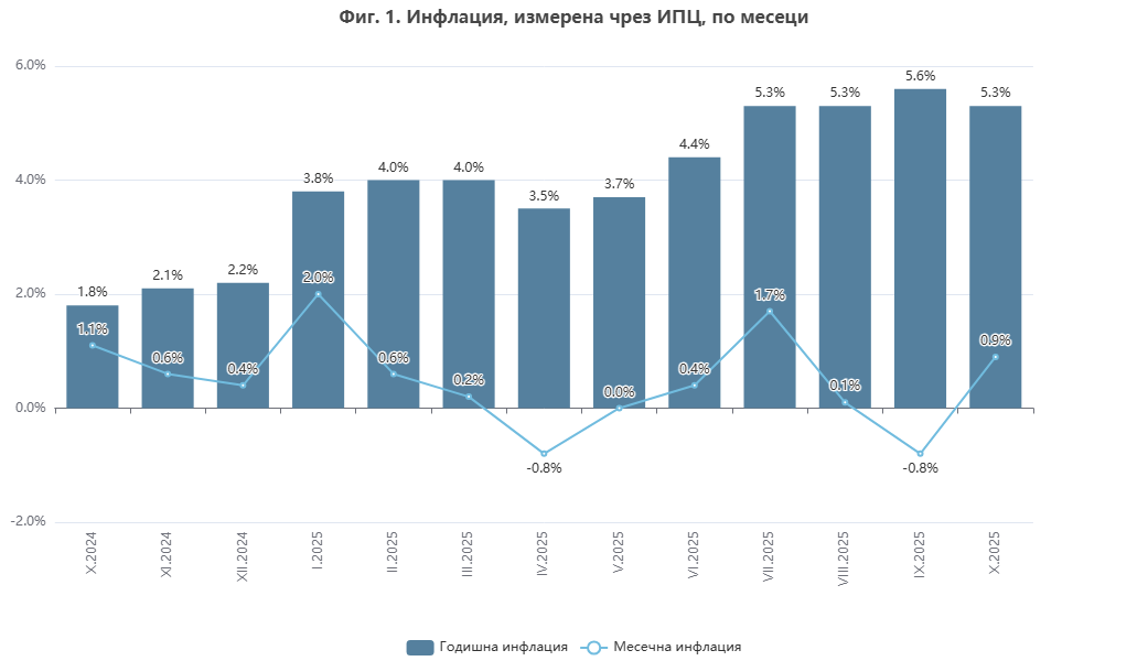 Инфлацията в България забавя леко темпа си на растеж през октомври, показват последните данни на Националния статистически институт. Годишната стойност на индекса достига ниво от 5,3% спрямо 5,6% през септември, предаде БНР.