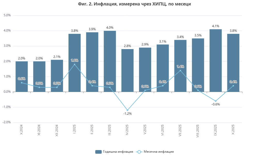 Хармонизираната инфлация (индексът HICP според общите европейски стандарти) през октомври се повишава с 0,4% на месечна база, докато хармонизираната потребителска инфлация на годишна база се забавя до 3,8% от 4,1% през септември.