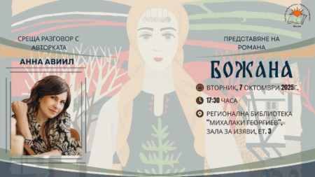 Своят нов роман "Божана" ще представи Анна Величкова, чийто творчески псевдоним е Анна Авиил. Авторката е от Видин, днес живее и работи в София. Тя определя книгата си като "патриотична", чиято цел е да възроди ценностите на българския народ. Представянето във Видин ще се състои днес, 7 октомври, в Залата за изяви на Регионална библиотека..