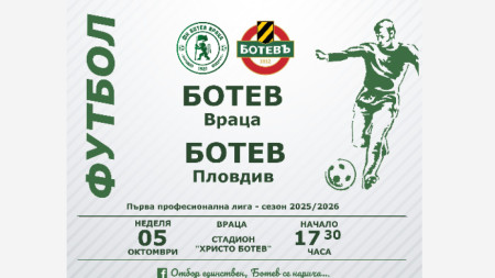 Ботев /Враца/ гони домакински успех срещу съименника си от Пловдив в мач от 11-ия кръг на Първа футболна лига. Двубоят е от 17,30 часа на стадион „Христо Ботев" в града под Околчица. Билетите за него са по 15 лева за централния сектор „А", а за всички останали входът е по 10 лева. Предстоящата среща е 70-ата между двата тима в елита. Врачани нямат..