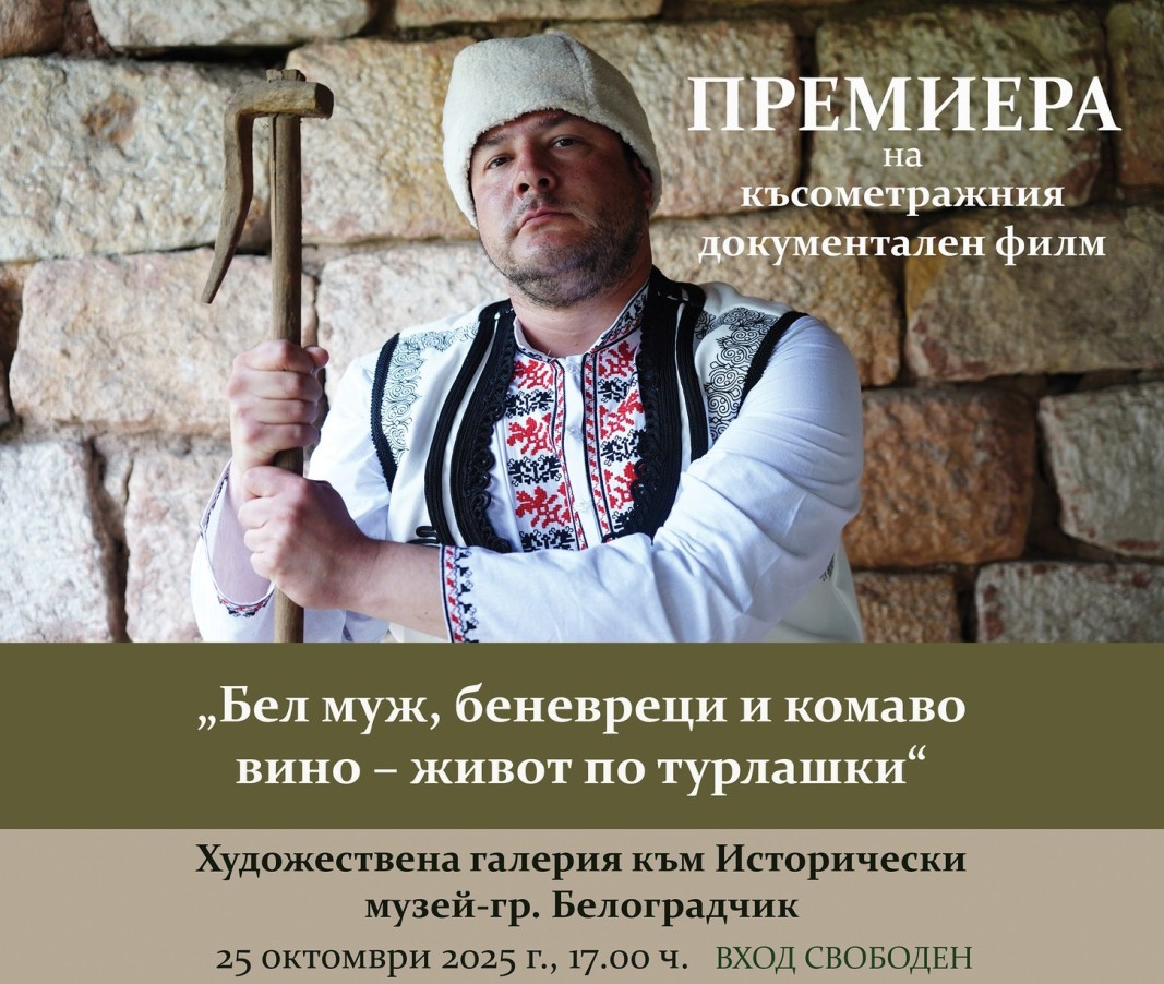 На 25 октомври от 17 ч. в Белоградчик ще е премиерата на късометражния документален филм "Бел муж, беневреци и комаво вино - живот по турлашки". Режисьор на лентата е Росен Найденов, оператор и монтаж - Васко Врачовски, а сценарият е на Анна Маринова.