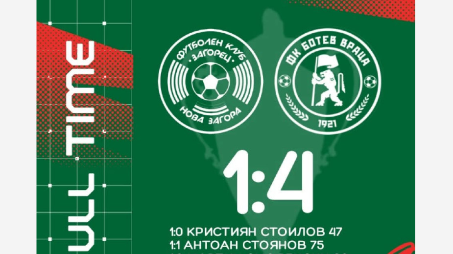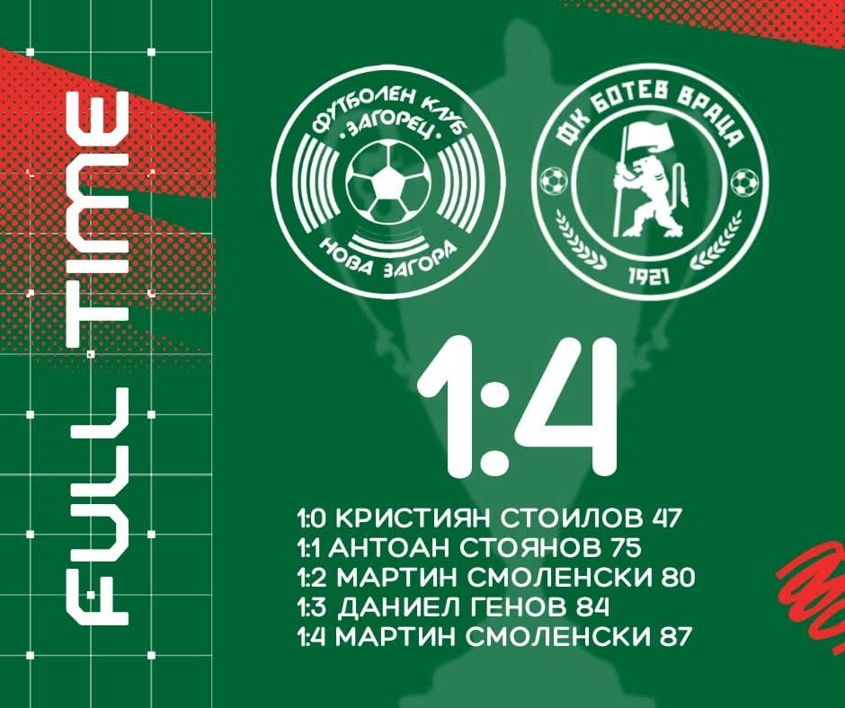 "Ботев" /Враца/ отново си поигра с нервите на своите привърженици и след пореден късен обрат се класира за осминафиналите в турнира за футболната купа на България. Елитният тим губеше с 0:1 до 77-та минута в Нова Загора от местния "Загорец". Третодивизионният тим откри резултата в 47-та мин. чрез Кристиян Стоилов. Минималната преднина на аматьорите се запази до 77-та мин., когато Антоан Стоянов изравни. Последваха две попадения на Мартин Смоленски в 80-та и 88-та минути, а Даниел Генов в 83-та мин. добави още едно попадение за крайното 4:1. Старши-треньорът Тодор Симов пусна в играта вратаря Василев и полевите играчи Кабаши, Чорбаджийски, Дичев, Маринов, Пешов, Цонев, Суда, Смоленски, Генов и Найденов.
