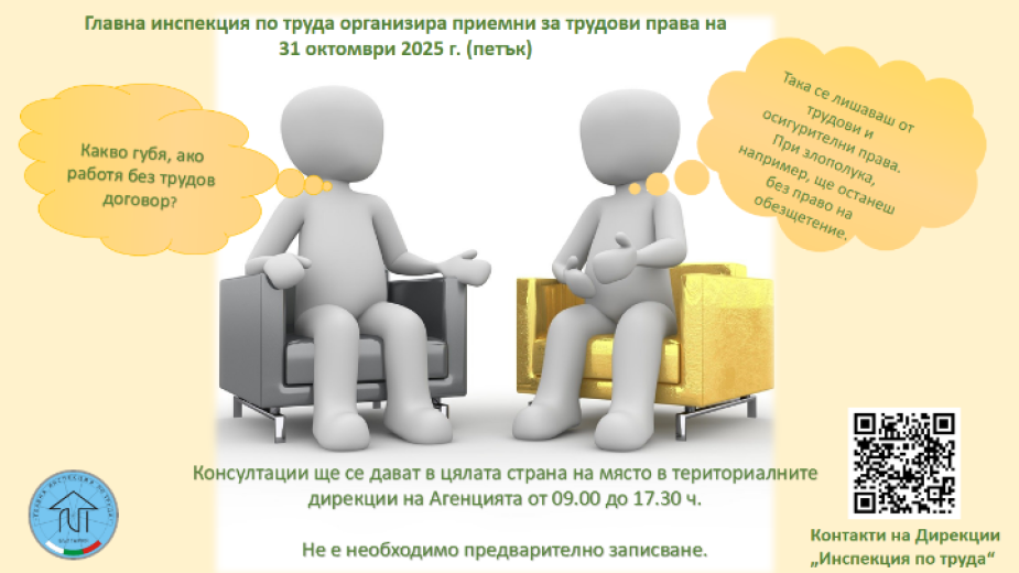 "Консултации днес в работното време на Дирекцията, от 9:00 до 17:30 часа, могат да получат всички граждани, които имат въпроси свързани със спазването на трудовото законодателство, в това число и осигуряването на здравословни и безопасни условия на труд. Тук трябва да отбележим, че служителите на инспекцията по труда дават консултации, на граждани, работодатели и длъжностни лица по всяко време, в рамките на установеното работно време на дирекцията, а не само в този ден. Консултации се дават както на място така и по телефона."